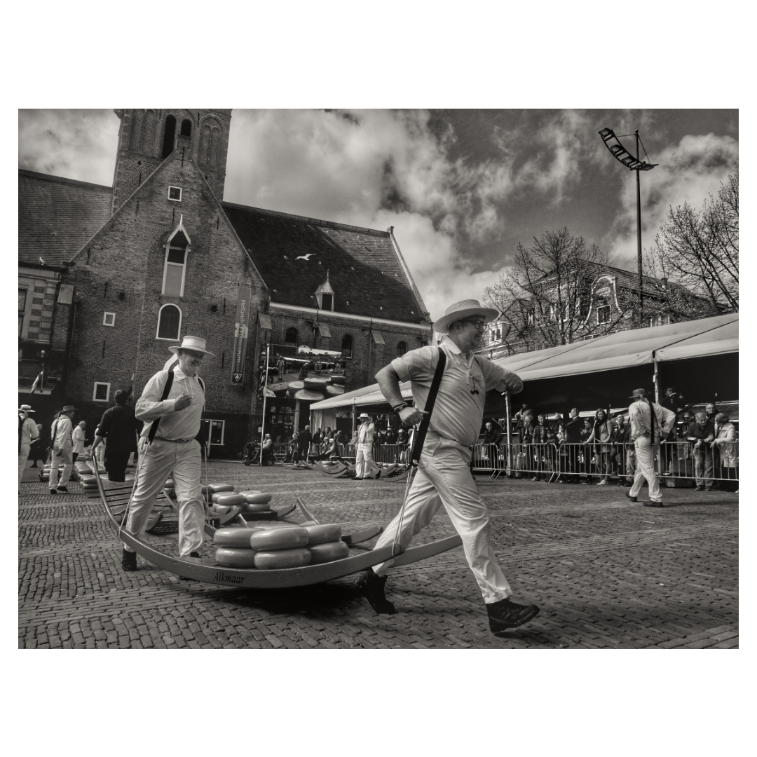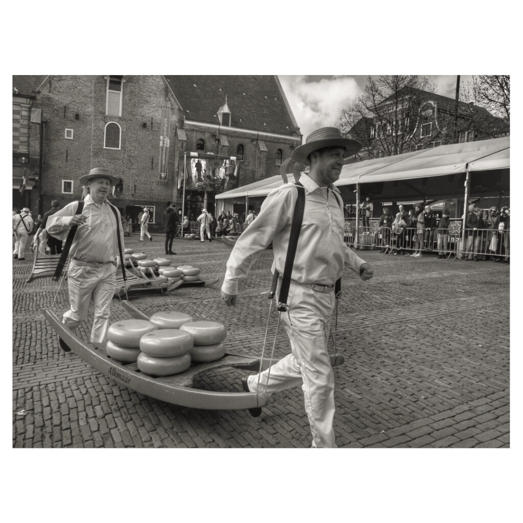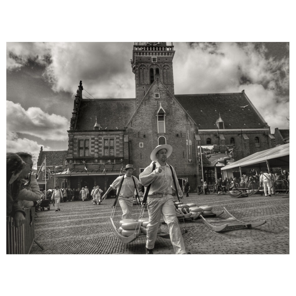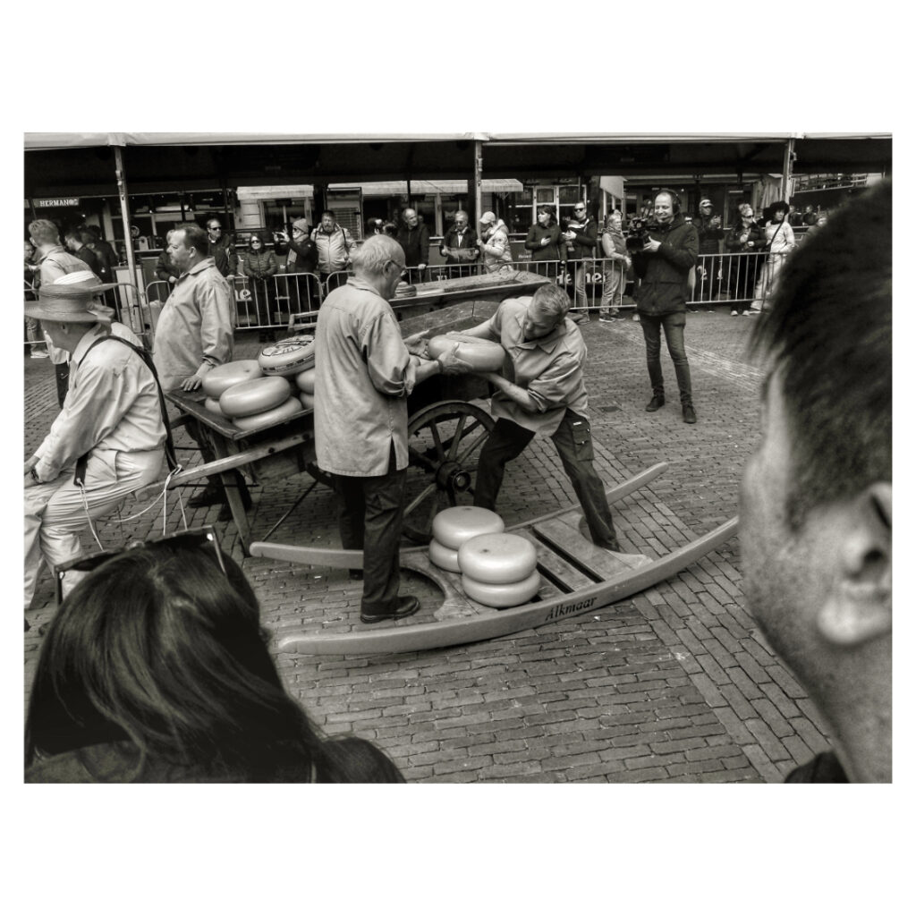 Cheese market in Alkmaar, tourists from all over the world come to see this spectacle. The cheese guild lifts the cheeses to the weighing house where the cheeses are weighed and traders buy and finally load the cheese.