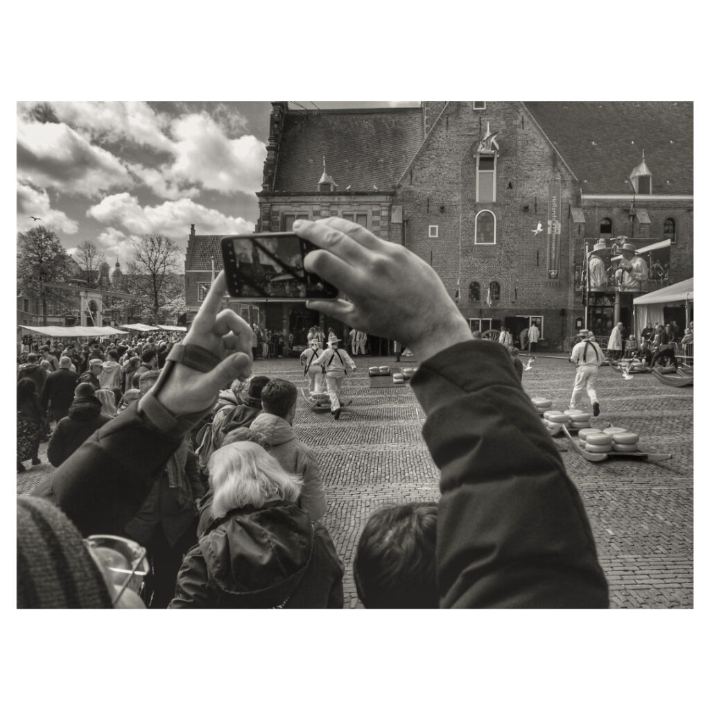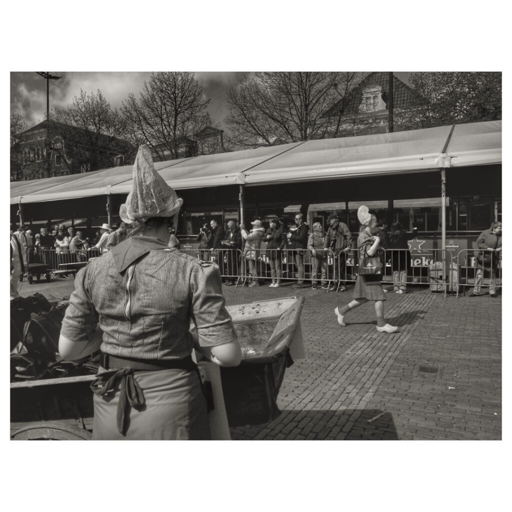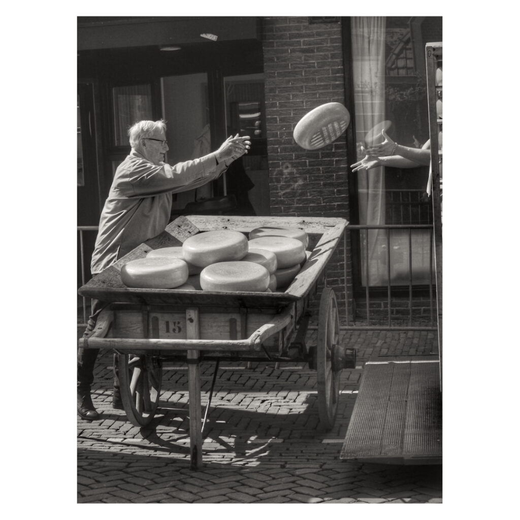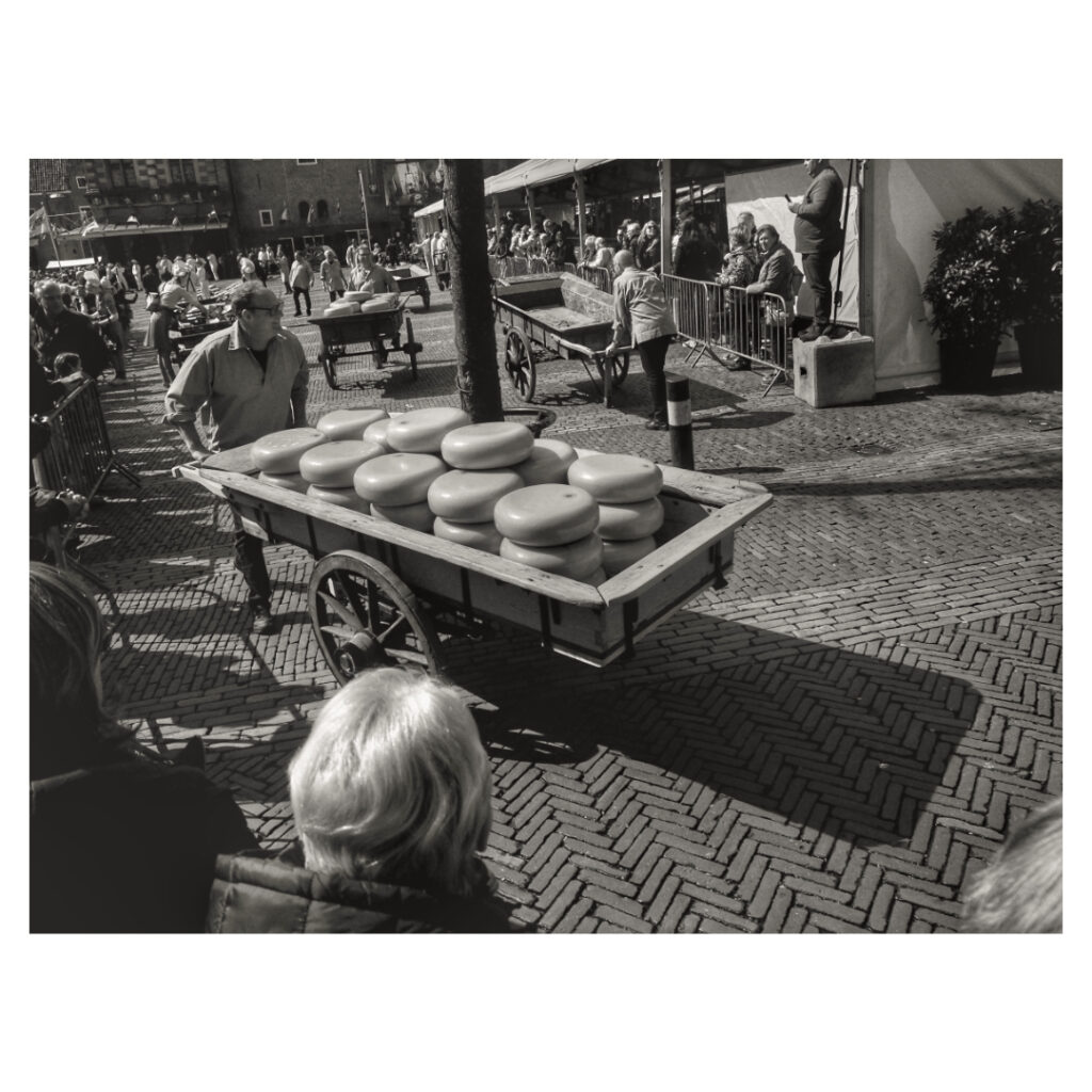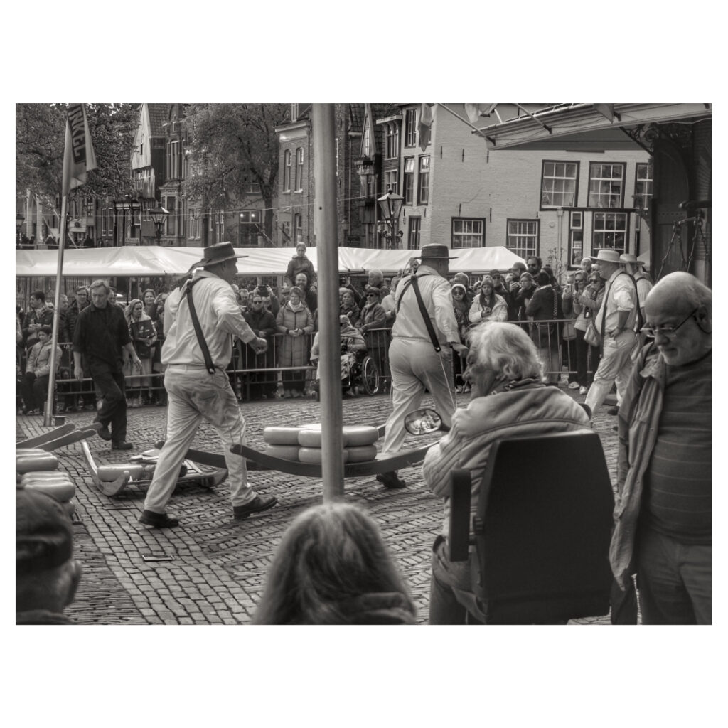 Cheese market in Alkmaar, tourists from all over the world come to see this spectacle. The cheese guild lifts the cheeses to the weighing house where the cheeses are weighed and traders buy and finally load the cheese.