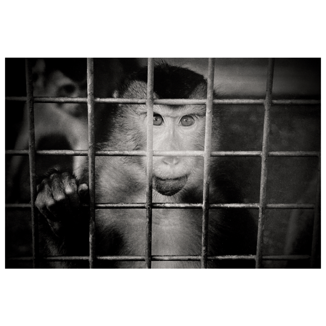Circus monkey behind bars stares intensely into the camera lens. (1995)